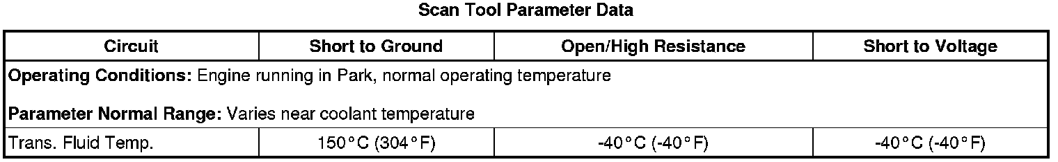 The automatic transmission fluid temperature (TFT) sensor is a negative coefficient thermistor. When the transmission fluid is cold, the sensor resistance is high. As the transmission fluid warms up, the sensor resistance decreases. This diagnostic monitors the TFT sensor circuit. The circuit may be functional but not in the normal operating range. This diagnostic indicates stuck, erratic, intermittent, or skewed values, resulting in reduced system performance. The TFT sensor range is -40 to +150°C (-40 to +304°F).