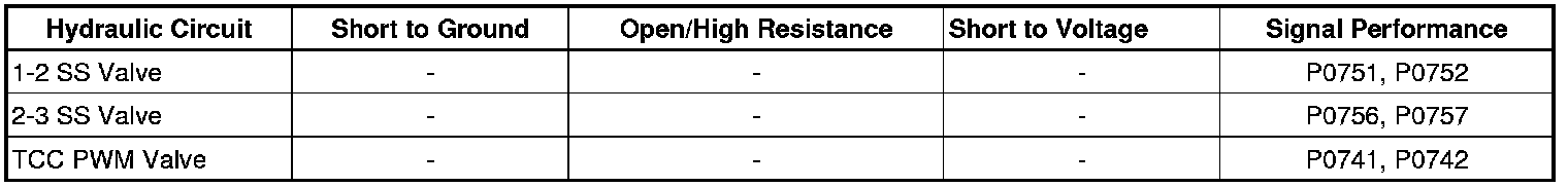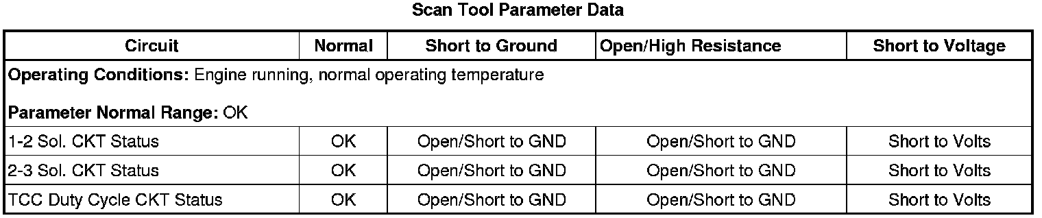 * It is possible for an internal TCM failure which may not allow sufficient current to operate the solenoids. Verify TCM functionality by commanding the suspected solenoid ON/OFF using the scan tool and listen for a click.