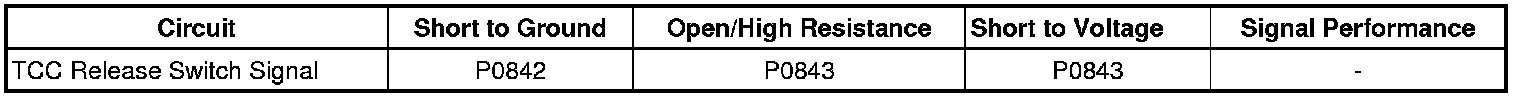The torque converter clutch (TCC) release switch is part of the transmission fluid pressure (TFP) manual valve position switch. The TFP manual valve position switch is mounted to the transmission valve body. The TCC release switch is normally closed. The switch signals the transmission control module (TCM) that the TCC is released. This is accomplished by torque converter release fluid pressure acting on the switch contact which opens the circuit. When the circuit voltage is high, the TCM recognizes that the TCC is no longer engaged.