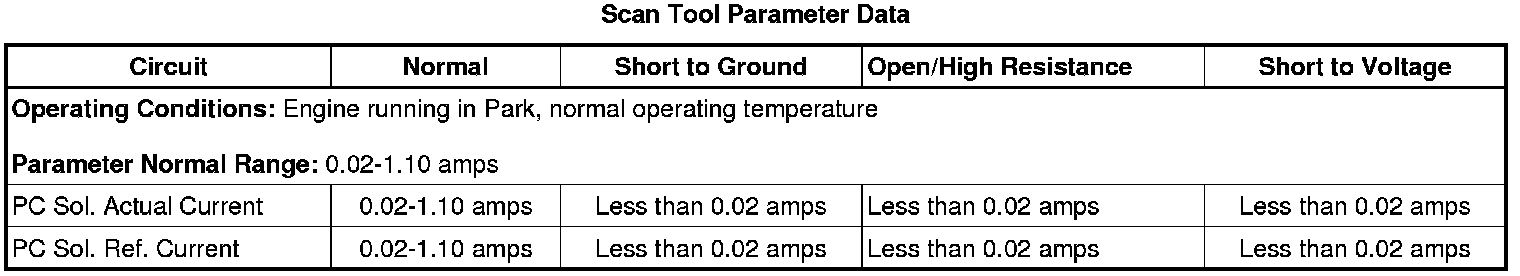 Start and idle the engine. Using the scan tool, select PC Solenoid under the Transmission Output Controls. With the scan tool, command several values of solenoid reference current from 0.1 amp through 1.1 amps and observe the PC Sol. Actual Current and the PC Sol. Ref. Current. The PC Sol. Actual Current should not vary from the PC Sol. Ref. Current by more than 0.16 amps.