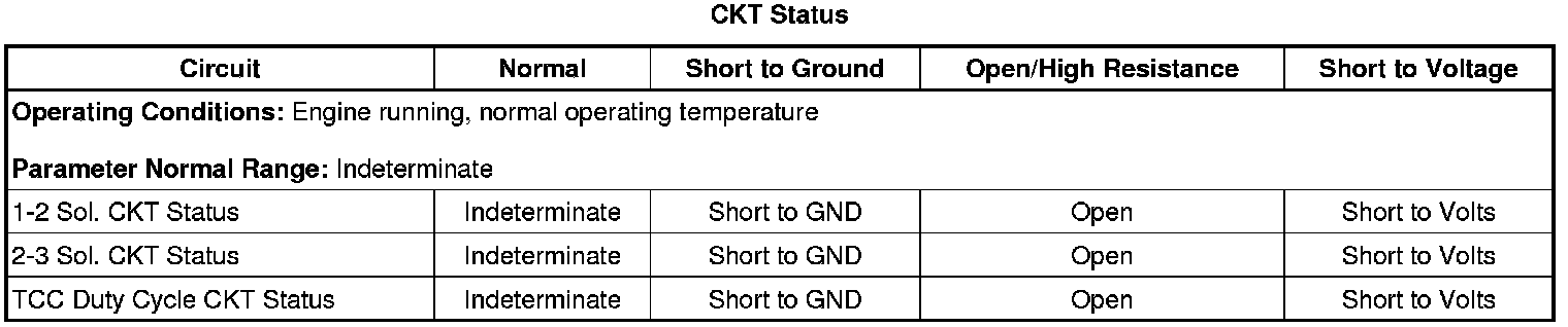 Start and idle the engine. Using the scan tool output controls command the 1-2 SS, 2-3 SS, and TCC PWM solenoid ON and OFF. Observing the CKT Status parameter on the scan tool, ensure the parameter shows OK.