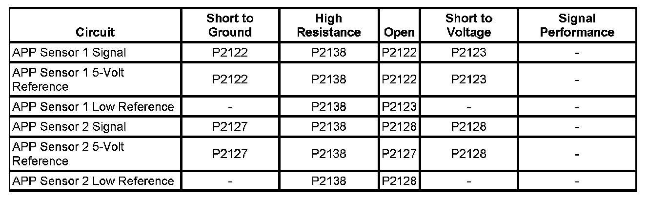 - Accelerator Pedal Position (APP) Sensor 1 Circuit High Voltage