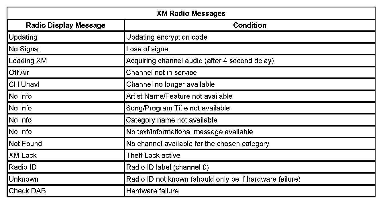 The radio communicates with the digital radio receiver (DRR) via the GMLAN data bus. When the radio communicates with the DRR, the virtual network (VN INFOTAINMENT) is activated by the radio. During this communication phase, the radio sends a specific GMLAN frame message to establish a link with the DRR. The DRR responds with a specific frame message back to the radio confirming the link was successful. The scan tool can be used to check if any remote device is connected to the radio. In this case, observe the RSE parameter in the Radio Data Display. The scan tool will indicate RSE - Present. When a XMI or XM2 frequency setting is selected from pressing a button on the radio, a specific GMLAN frame message is sent to the DRR to change to the selected frequency. During XM operation the audio signals are sent over the left and right audio signal circuits from the DRR to the radio.
