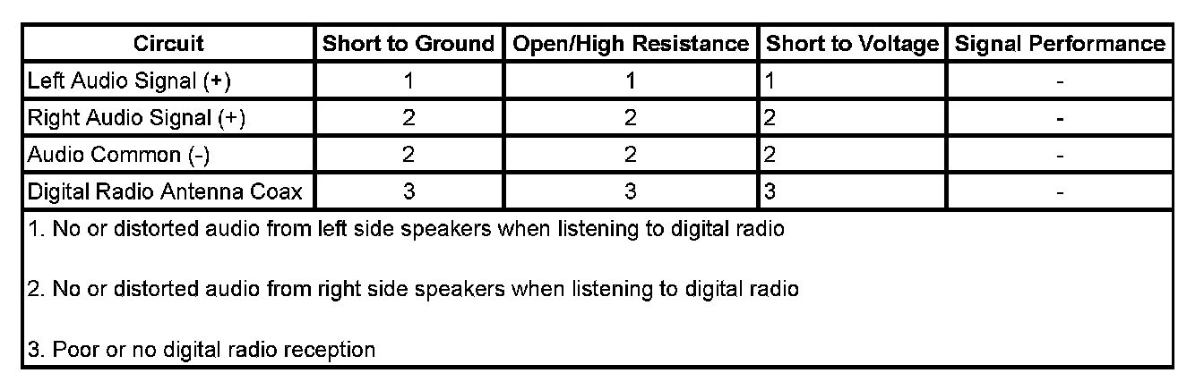 • If either side of the vehicle is not producing sound or the sound produced is distorted, refer to Digital Radio Signal Circuit Malfunction.