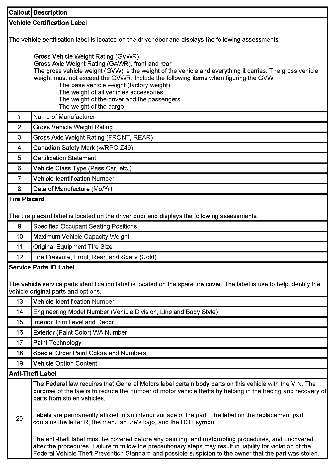 Vehicle Certification, Tire Placard, Anti-Theft, and Service Parts ID Label