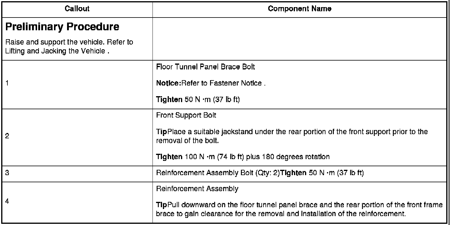 TipPull downward on the floor tunnel panel brace and the rear portion of the front frame brace to gain clearance for the removal and installation of the reinforcement.
