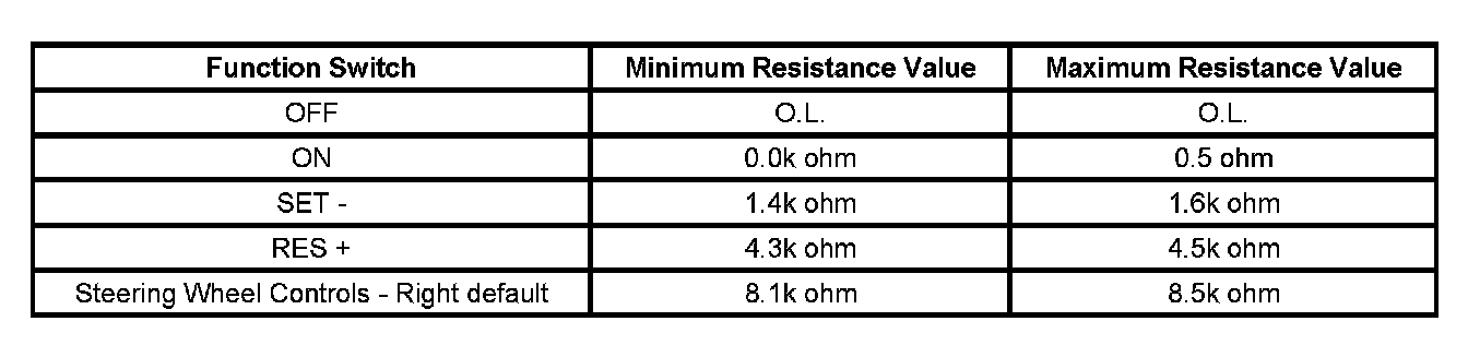 • If any of the resistance measurements for the - SET, + RES, and the default value are not within the listed resistance values, replace the steering wheel controls - right switch assembly.
