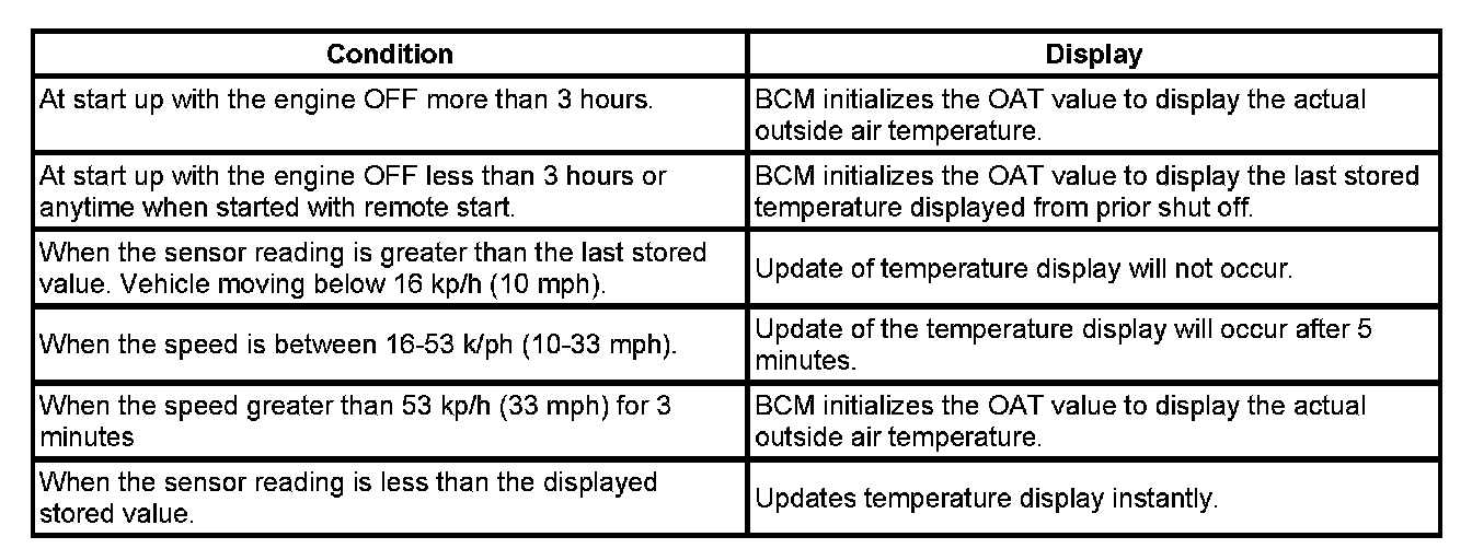 The Radio/IPC displays the outside air temperature value that it receives through a Low Speed GMLAN message. The scan tool has the ability to update the displayed ambient air temperature. The HVAC Manual Tech 2 shows the ambient air temperature sensor feedback voltage under Body and Accessories / Data Display / BCM. The HVAC Auto System there is a temperature reading under HVAC / Data Display / HVAC / Sensor Data. Both readings are unfiltered so it is possible that the temperature read on the tech 2 will differ from the temperature displayed on the DIC/Radio without there being a problem with the vehicle. The DIC/Radio only displays the reading being sent from the BCM. The outside air temperature value is displayed or updated under the following conditions:
