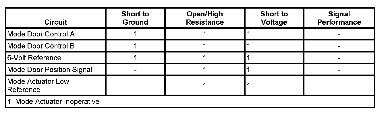 The actuators operate using 5 circuits. A 5-volt reference, low reference, signal circuit and two bi-directional 0 or 12 volt control circuits. The HVAC control module supplies a low reference and 5-volt reference to the potentiometer. The HVAC control module monitors the voltage drop across the potentiometer on the door position signal circuit. As the actuator door changes position the door position signal circuit voltage also changes. The two bi-directional control circuits enable the actuator to operate. Both circuits are set to 0 volts when the HVAC control module detects, from the feedback potentiometer, that the actuator is in the desired position. In order to move the actuator, the HVAC control module switches the appropriate control circuit to 12 volts.