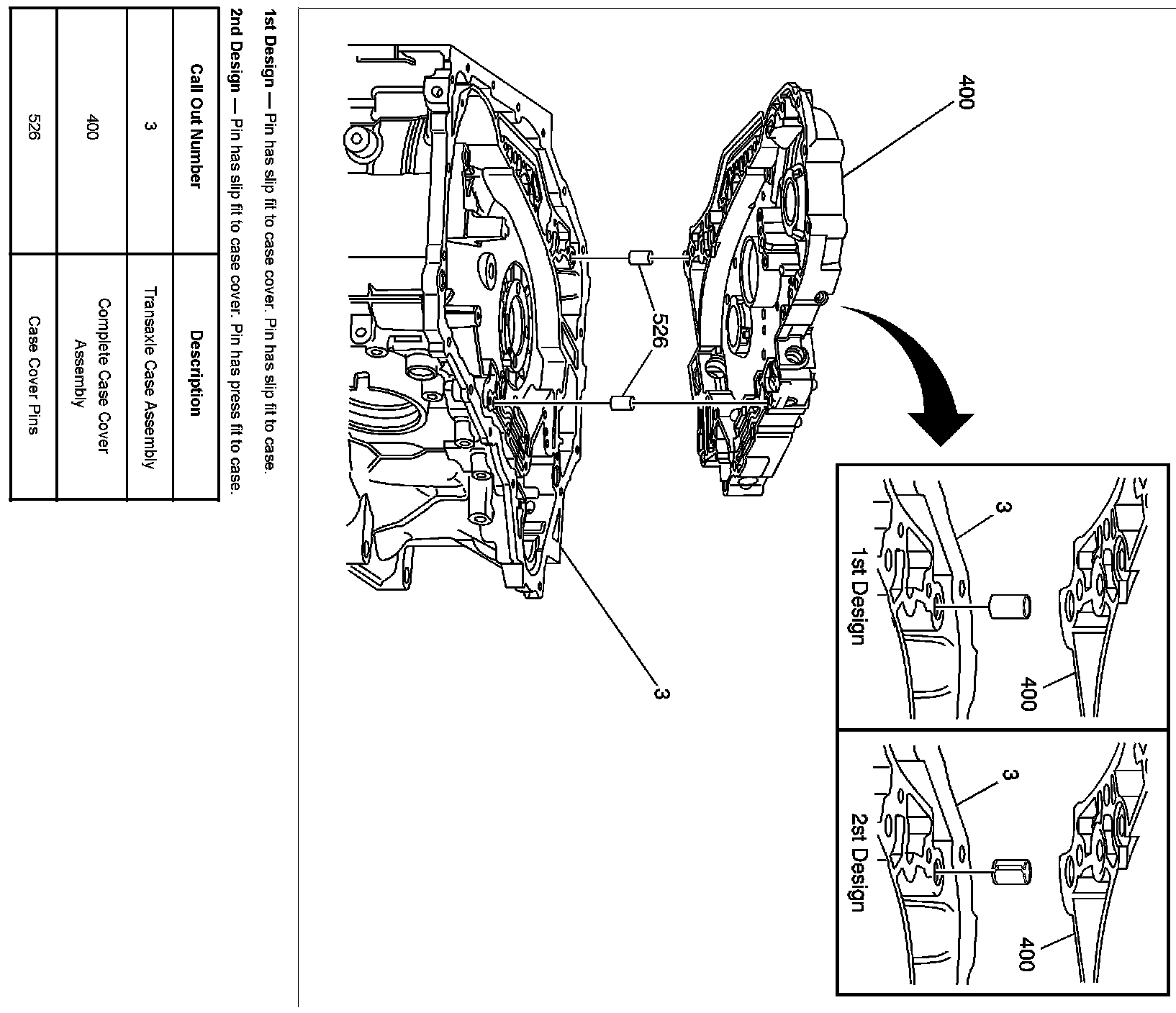 When servicing a transaxle built prior to 12/4/07 (Julian Date 338) with a new case cover, you MUST replace the 1st design solid dowel pins with 2nd design split dowel pins.