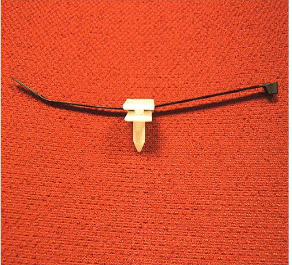4. Disconnect the right cooling fan electrical connector. Remove the wiring harness clip from the fan shroud. Connect the engine cooling fan jumper harness to the fan connection. Secure the jumper harness to the fan shroud (location 1) using the clip. Install a tie strap through the retainer as shown, and install the retainer into the existing hole in the frame (location 2). Secure the harness to the retainer using the tie strap.