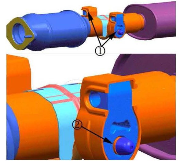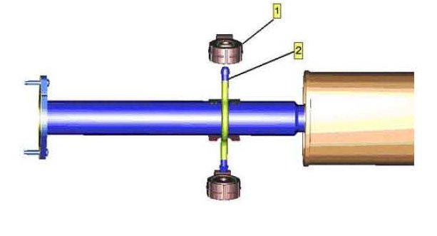 7. Install the isolator (1) to the muffler hanger rod (2).