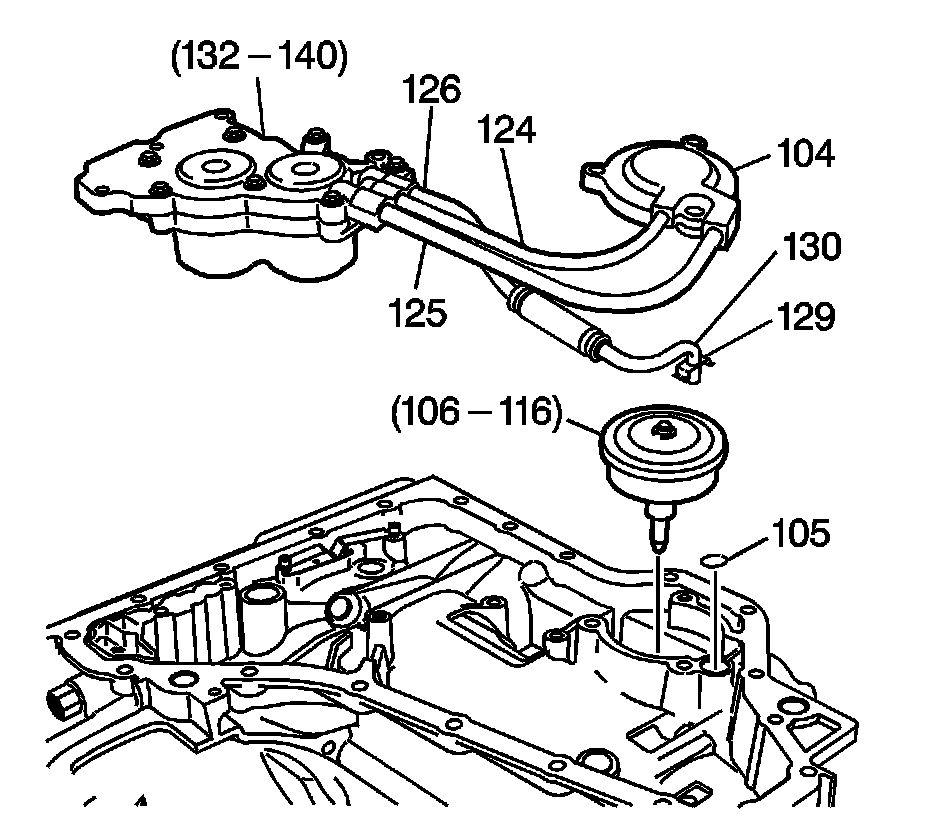 5. Remove the 1-2 and 2-3 accumulator assembly (132-140), the pipe assembly (124-126) and the manual 2-1 band servo cover (104).