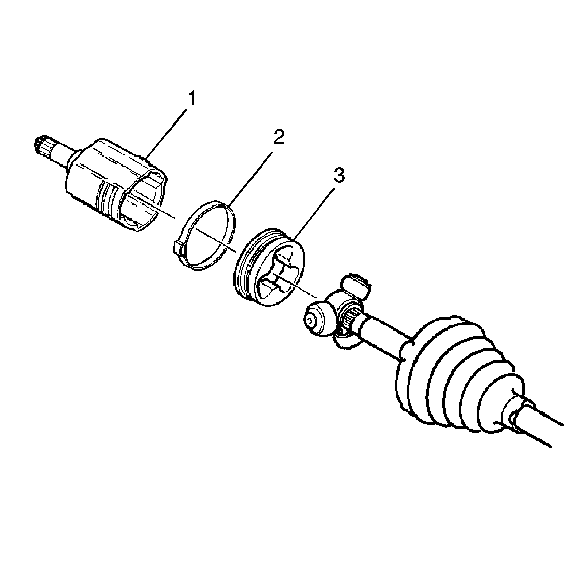 12. Slide the large diameter of the halfshaft inboard seal (2), with larger clamp (3) in place, over the outside of the trilobal tripot bushing and locate the lip of the seal in the groove.