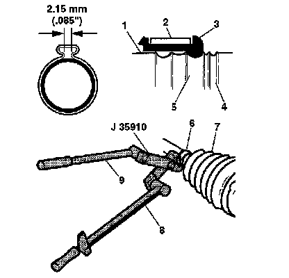2. Remove the large seal retaining clamp (2) from the tripot joint with side cutters. Discard the large seal retaining clamp.