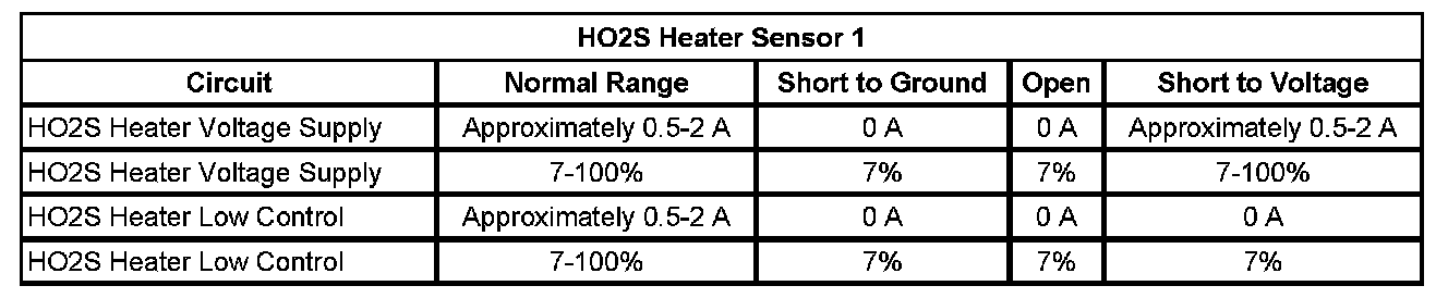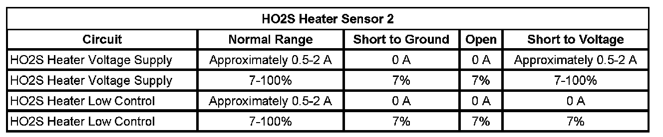 * The HO2S heater current is less than 0.31 amp or more than 1.5 amps for more than 8 seconds, twice within a 1-minute test period.