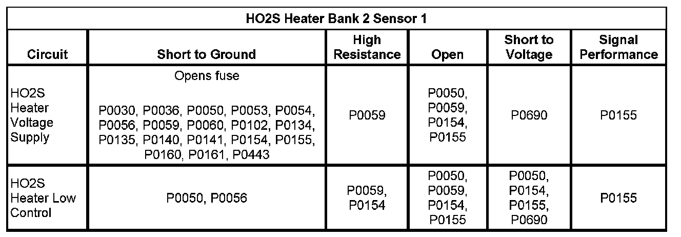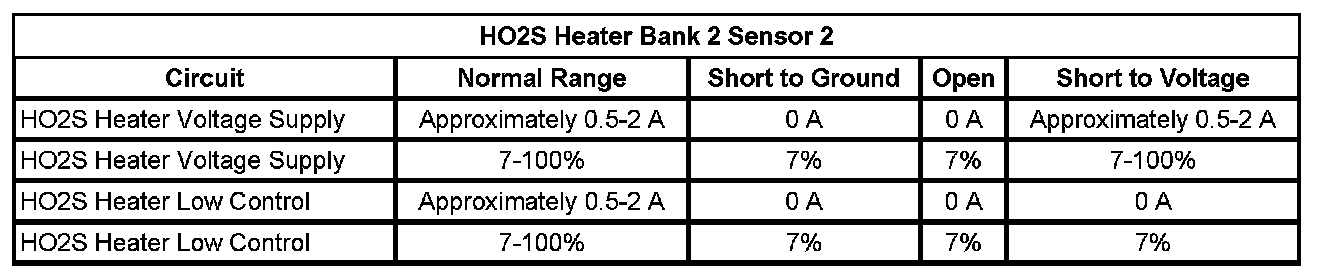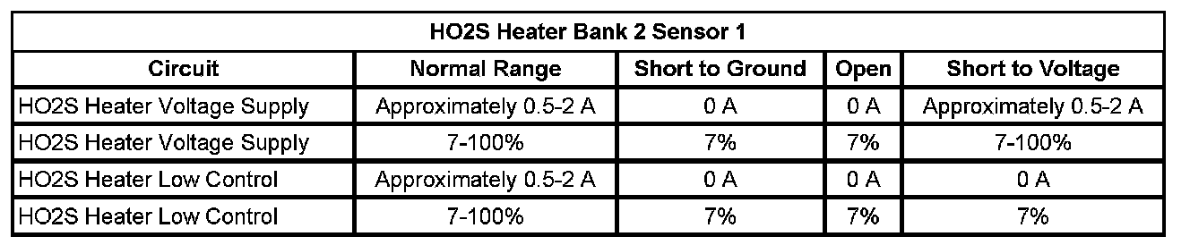 * The HO2S heater current is less than 0.31 amp or more than 1.5 amps for more than 8 seconds, twice in a 1-minute period.
