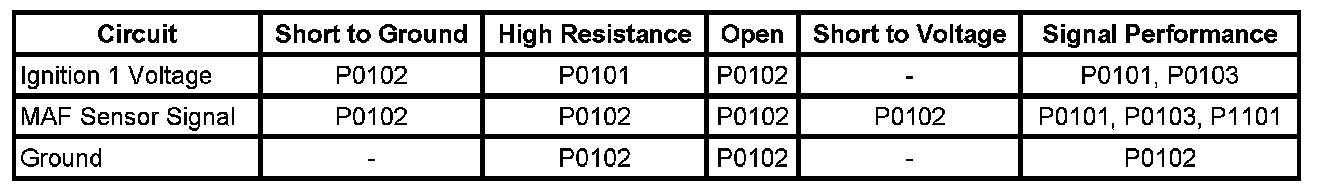 * A steady or intermittent high resistance of 15 ohms or greater on the ignition 1 voltage circuit will cause the MAF sensor signal to be increased by as much as 60 g/s.