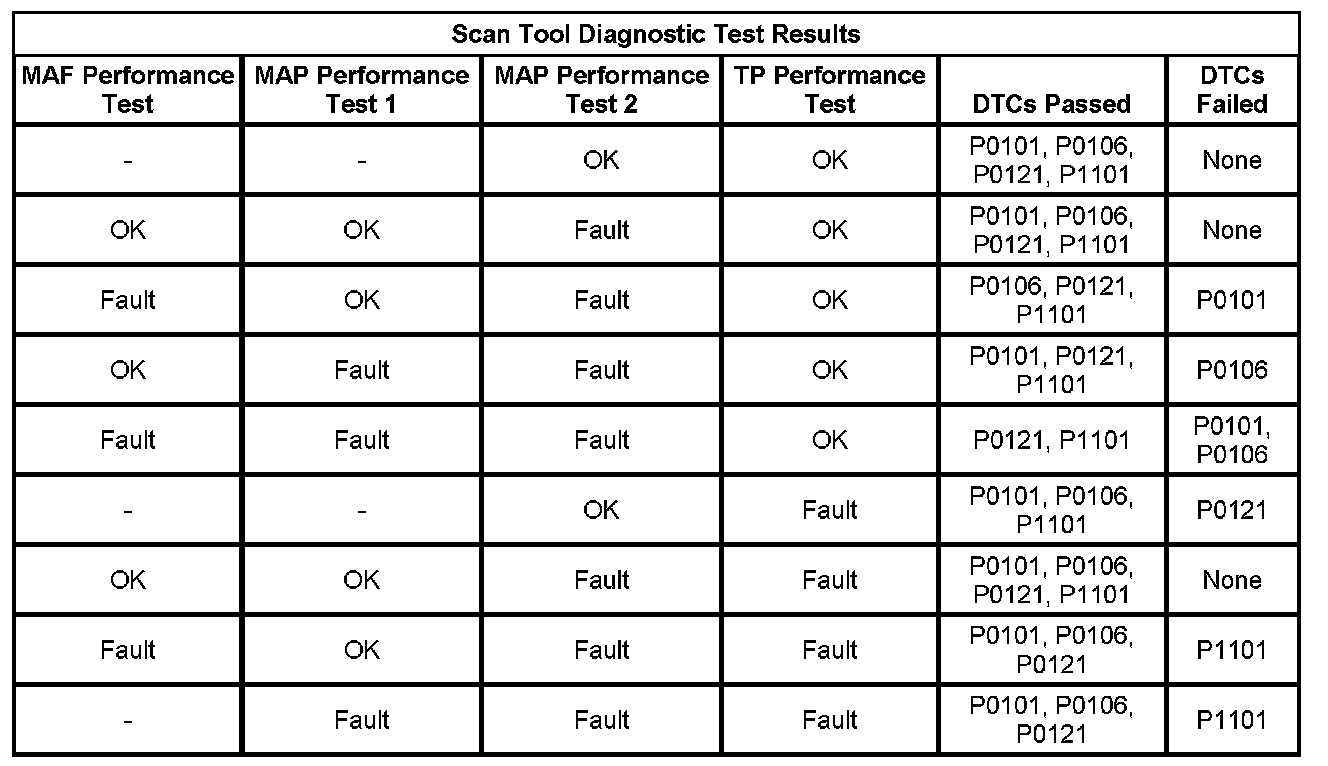 The estimates of MAF and MAP obtained from this system of models and calculations are then compared to the actual measured values from the MAF, MAP, and the TP sensors and to each other to determine the appropriate DTC to fail. The following table illustrates the possible failure combinations and the resulting DTC or DTCs.