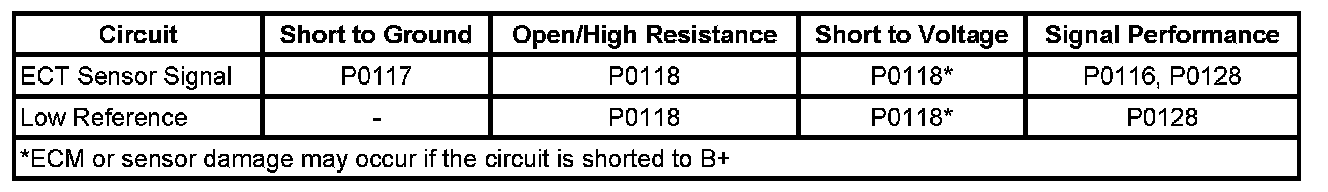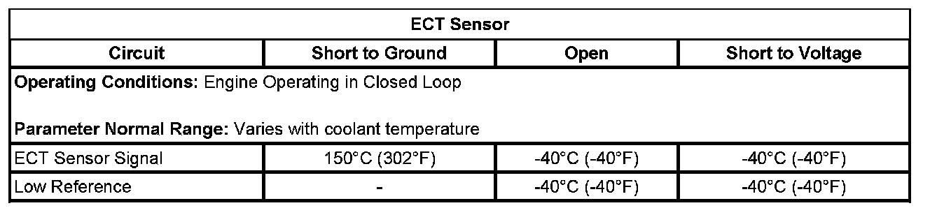 The ECM detects that the ECT sensor parameter is colder than -39°C (-38°F) for greater than 5 seconds.