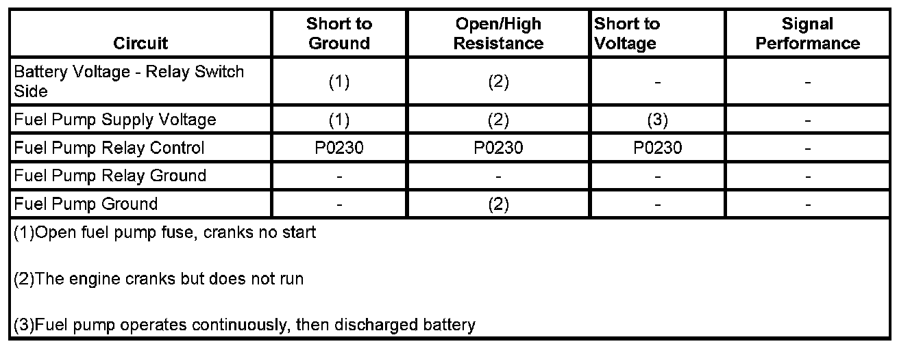 The ECM monitors the voltage on the fuel pump relay control circuit. If the ECM detects an incorrect voltage on the fuel pump relay control circuit, a fuel pump relay control DTC sets.