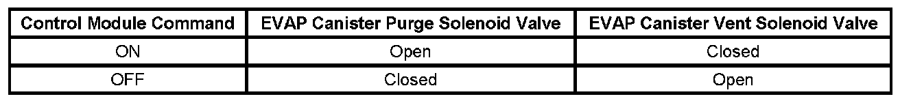 This DTC tests for undesired intake manifold vacuum flow to the evaporative emission (EVAP) system. The engine control module (ECM) seals the EVAP system by commanding the EVAP canister purge solenoid valve OFF and the EVAP canister vent solenoid valve ON. The ECM monitors the fuel tank pressure (FTP) sensor to determine if a vacuum is being drawn on the EVAP system. If vacuum in the EVAP system is more than a predetermined value within a predetermined time, this DTC sets. The following table illustrates the relationship between the ON and OFF states, and the Open or Closed states of the EVAP canister purge and vent solenoid valves.