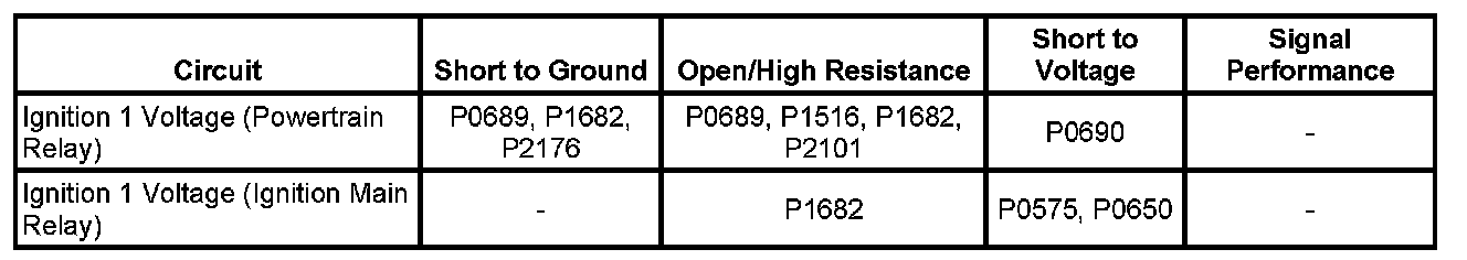 The ignition 1 voltage of the Run/Crank relay is more than 2 volts different than the ignition 1 voltage of the powertrain relay for more than 2 seconds.