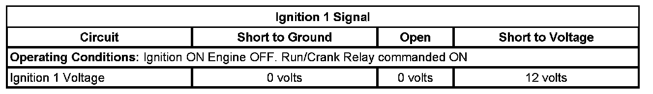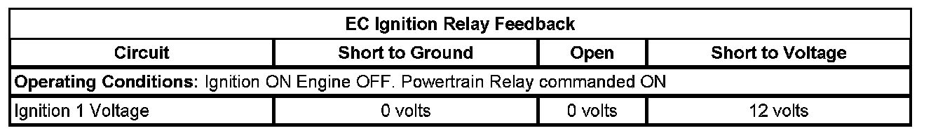 2. Ignition ON, engine OFF, observe both the Ignition 1 voltage signal and the EC Ignition Relay Feedback signal parameters on the scan tool. Both parameter values should display no more than 3 volts difference between the 2 parameters.