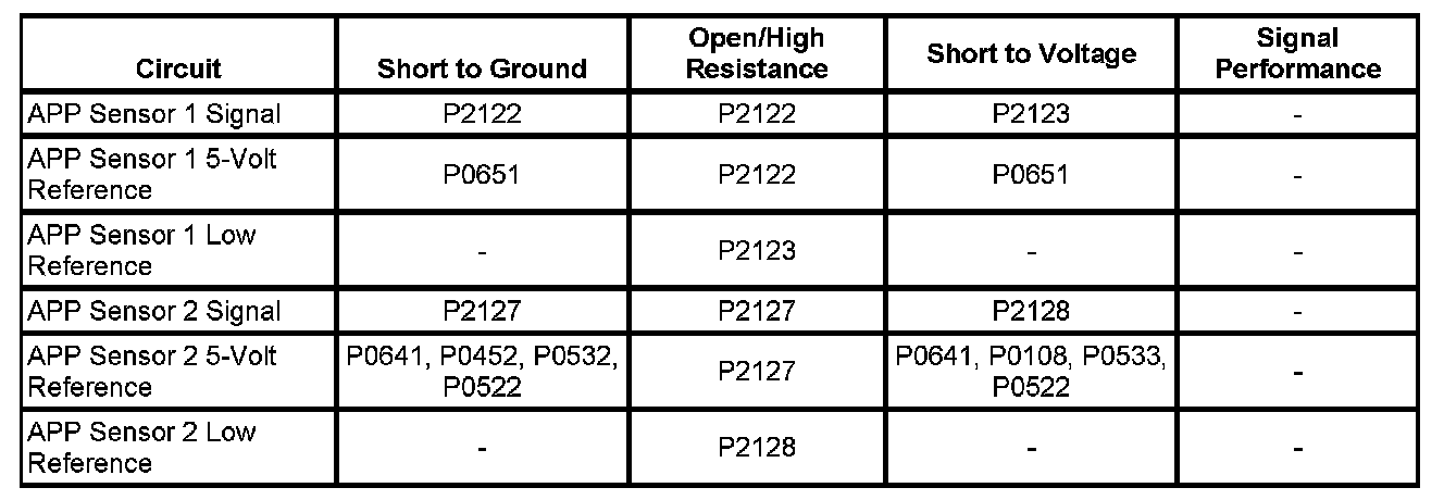 - Accelerator Pedal Position (APP) Sensor 1 Circuit Low Voltage