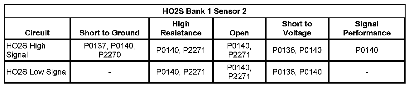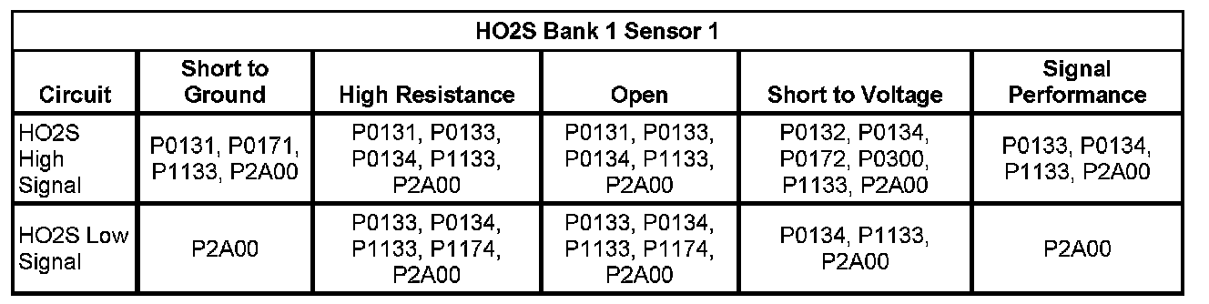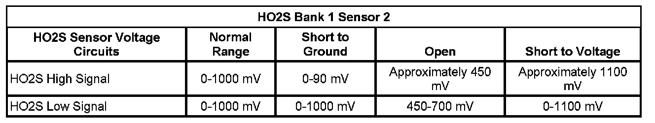 * The ECM detects that the HO2S 1 signal voltage is less than 50 mV for more than 25 seconds.