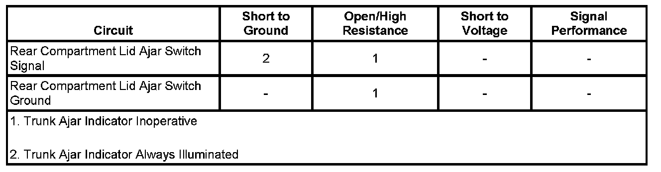 When the ignition is ON, the body control module (BCM) supplies battery positive voltage to the rear compartment lid ajar switch through the rear compartment lid ajar switch signal circuit. When the rear compartment lid is opened, the signal circuit is connected to ground through the rear compartment lid ajar switch ground circuit and the voltage is pulled low within the BCM. In response, the BCM sends a serial data message to the driver information center (DIC) in the instrument panel cluster (IPC) to illuminate the rear compartment lid ajar indicator.