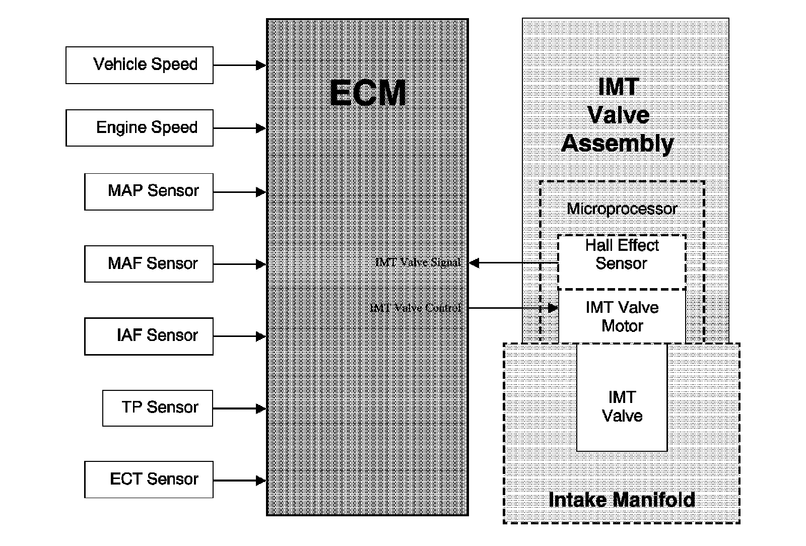 When the IMT valve is rotated, the hall-effect sensor is reporting the position of the valve to the microprocessor. The microprocessor then sends a frequency back to the engine control module (ECM). The ECM uses this feedback signal to determine the position of the IMT valve.