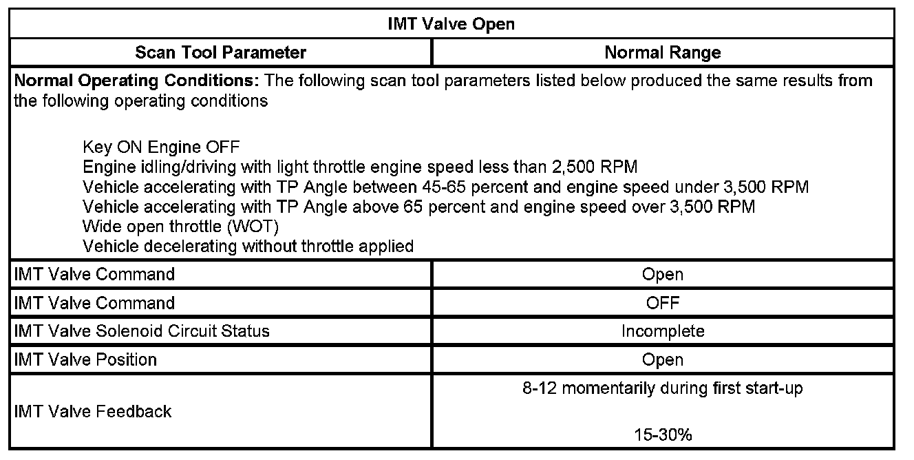 The intake manifold tuning (IMT) valve system uses variable air induction tuning in order to achieve maximum performance and efficiency over the entire operating range of the engine. The characteristic torque curve of a normally aspirated engine depends mainly on how the engines average pressure changes over the engine speed range. The average pressure is proportional to the volume of the air mass present in the cylinder when the inlet valve is closed. The design of the inlet system determines how large an air mass can be drawn into a cylinder at a given engine speed. An IMT valve is used to change the intake manifold plenum configuration. When the IMT valve is open, the intake manifold is configured to one large plenum. When the IMT valve is closed, the intake manifold is configured to 2 smaller plenums. The 2 intake manifold plenum sizes result in different torque curves, which improves performance at low and high engine speeds. During low speed, high load conditions the IMT valve is closed creating a longer runner path inside the plenum, which increases torque. During higher engine speeds and loads, the IMT valve opens creating a shorter runner path inside the plenum, which increases horsepower.