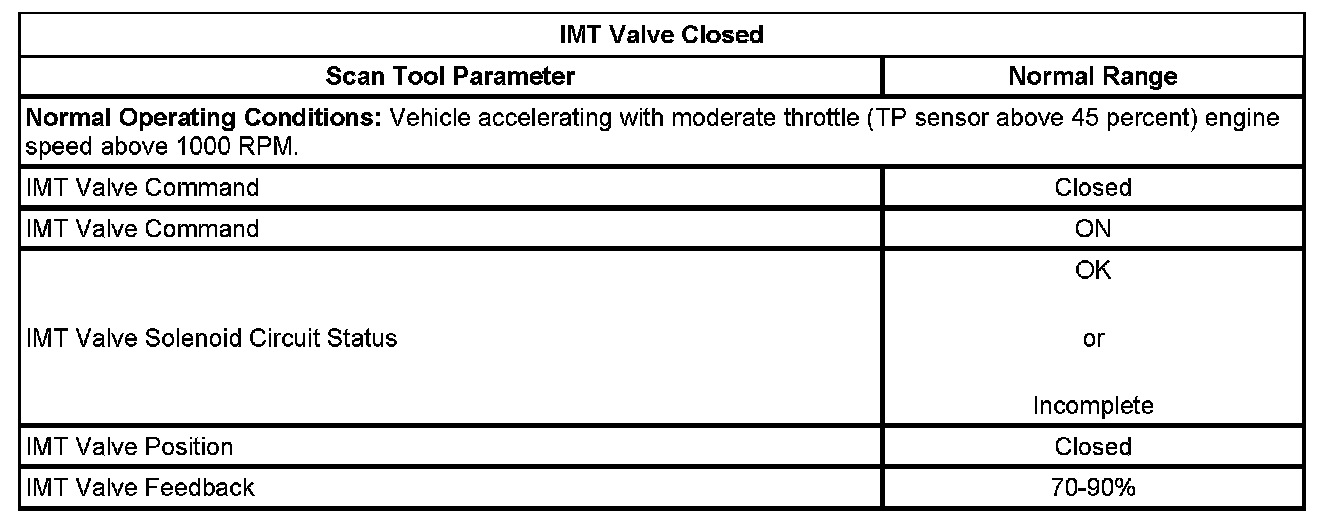 During operation when the valve is open, the control module applies ground to the IMT valve control circuit, which indicates to the microprocessor within the IMT valve to position the valve to the closed position, which turns the motor ON and rotates the IMT valve within the intake manifold plenum.