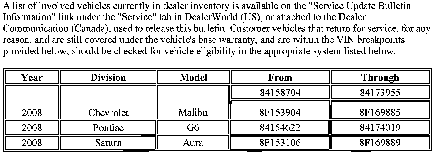 Dealers are to confirm vehicle eligibility prior to beginning repairs by using the system below. Not all vehicles within the above breakpoints may be involved.