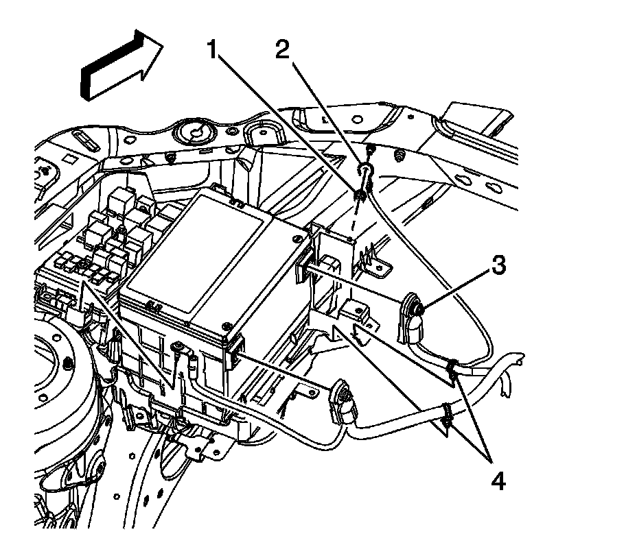 9. Remove the battery cable ground lead (2) from the studnut (1).