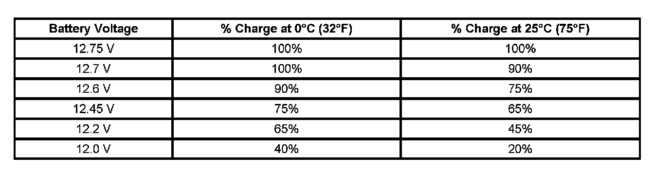 Important: Using voltage to determine the batteries state of charge (SOC) is only accurate after the battery has been at rest for 24 hours. This is enough time for the acid in each cell to equalize. If the battery has been charged or discharged in the past 24 hours, the battery SOC will only be an estimate.