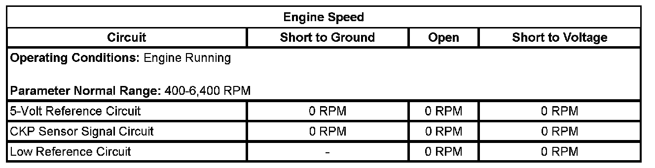 The crankshaft position (CKP) sensor circuits consist of an engine control module (ECM) supplied 5-volt reference circuit, low reference circuit and an output signal circuit. The CKP sensor is an internally magnetic biased digital output integrated circuit sensing device. The sensor detects magnetic flux changes of the teeth and slots of a 58-tooth reluctor wheel on the crankshaft. Each tooth on the reluctor wheel is spaced at 60-tooth spacing, with 2 missing teeth for the reference gap. The CKP sensor produces an ON/OFF DC voltage of varying frequency, with 58 output pulses per crankshaft revolution. The frequency of the CKP sensor output depends on the velocity of the crankshaft. The CKP sensor sends a digital signal, which represents an image of the crankshaft reluctor wheel, to the ECM as each tooth on the wheel rotates past the CKP sensor. The ECM uses each CKP signal pulse to determine crankshaft speed and decodes the crankshaft reluctor wheel reference gap to identify crankshaft position. This information is then used to determine the optimum ignition and injection points of the engine. The ECM also uses CKP sensor output information to determine the camshaft relative position to the crankshaft, to control camshaft phasing, and to detect cylinder misfire.