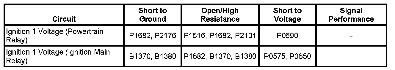 There are 2 ignition 1 voltage circuits supplied to the engine control module (ECM). The first ignition 1 voltage circuit is provided by the powertrain relay through a fuse. This ignition 1 voltage circuit supplies power to all the internal ECM circuits associated with the throttle actuator control (TAC) operation. The ignition main relay provides the second ignition 1 voltage circuit to the ECM through a fuse. This ignition 1 voltage provides power to other internal ECM circuits, except those associated with TAC operation. The ECM continuously monitors the voltage level difference between the 2 circuits.