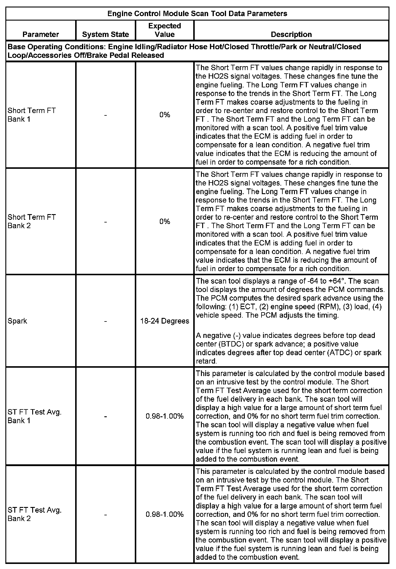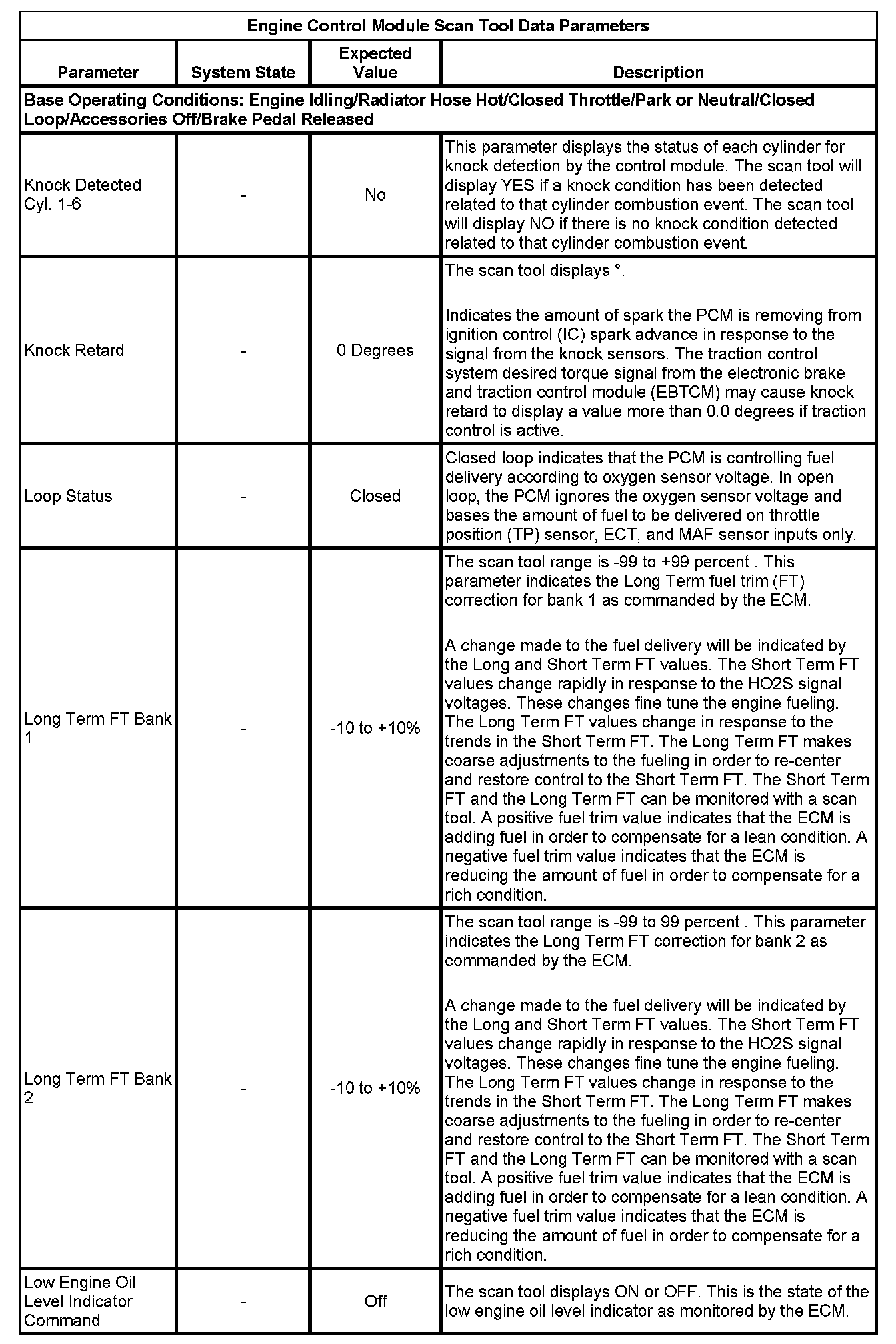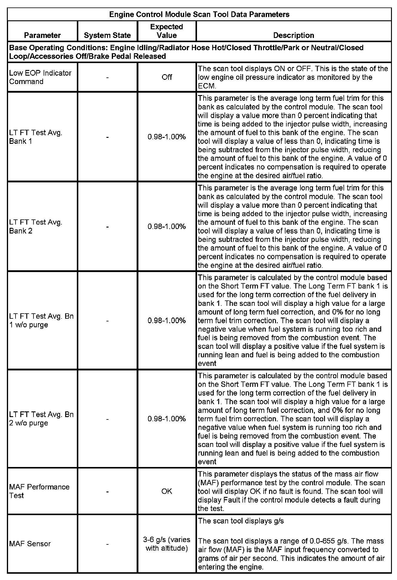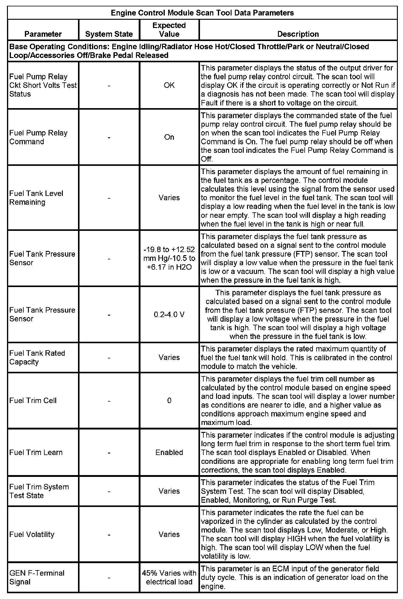 The scan tool values from a properly running engine may be used for comparison with the engine you are diagnosing. The Engine Scan Tool Data List represents values that would be seen on a normally running engine.