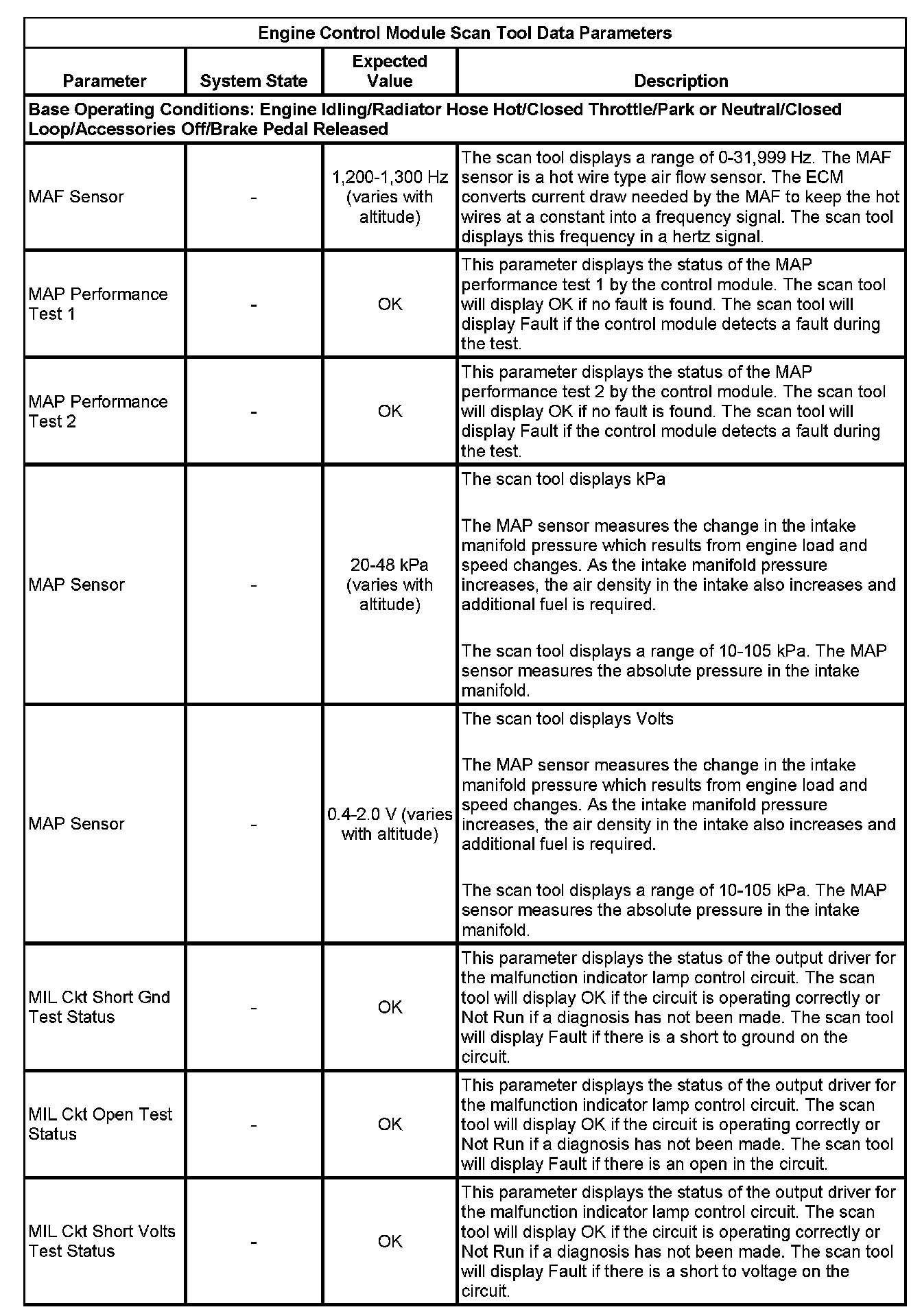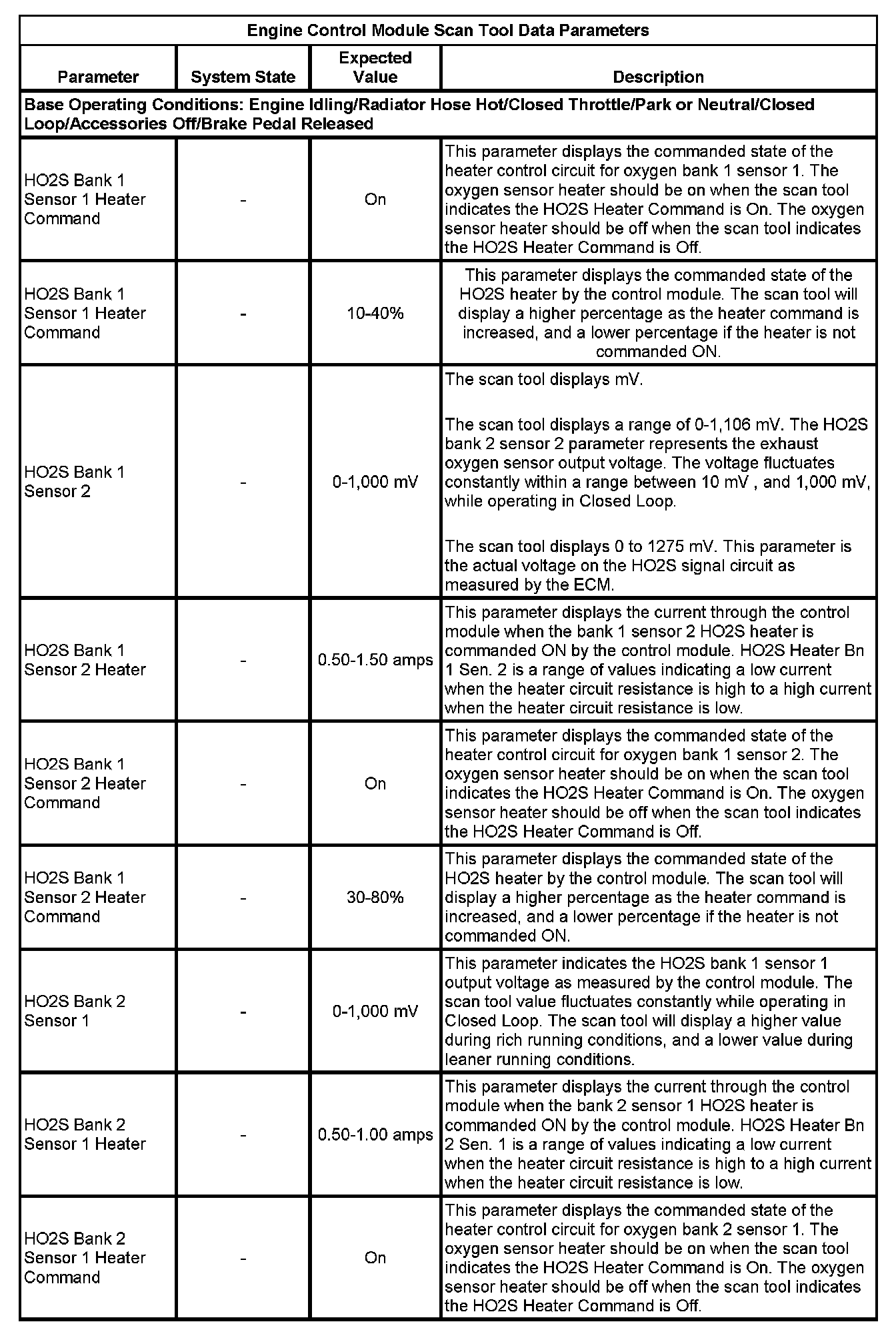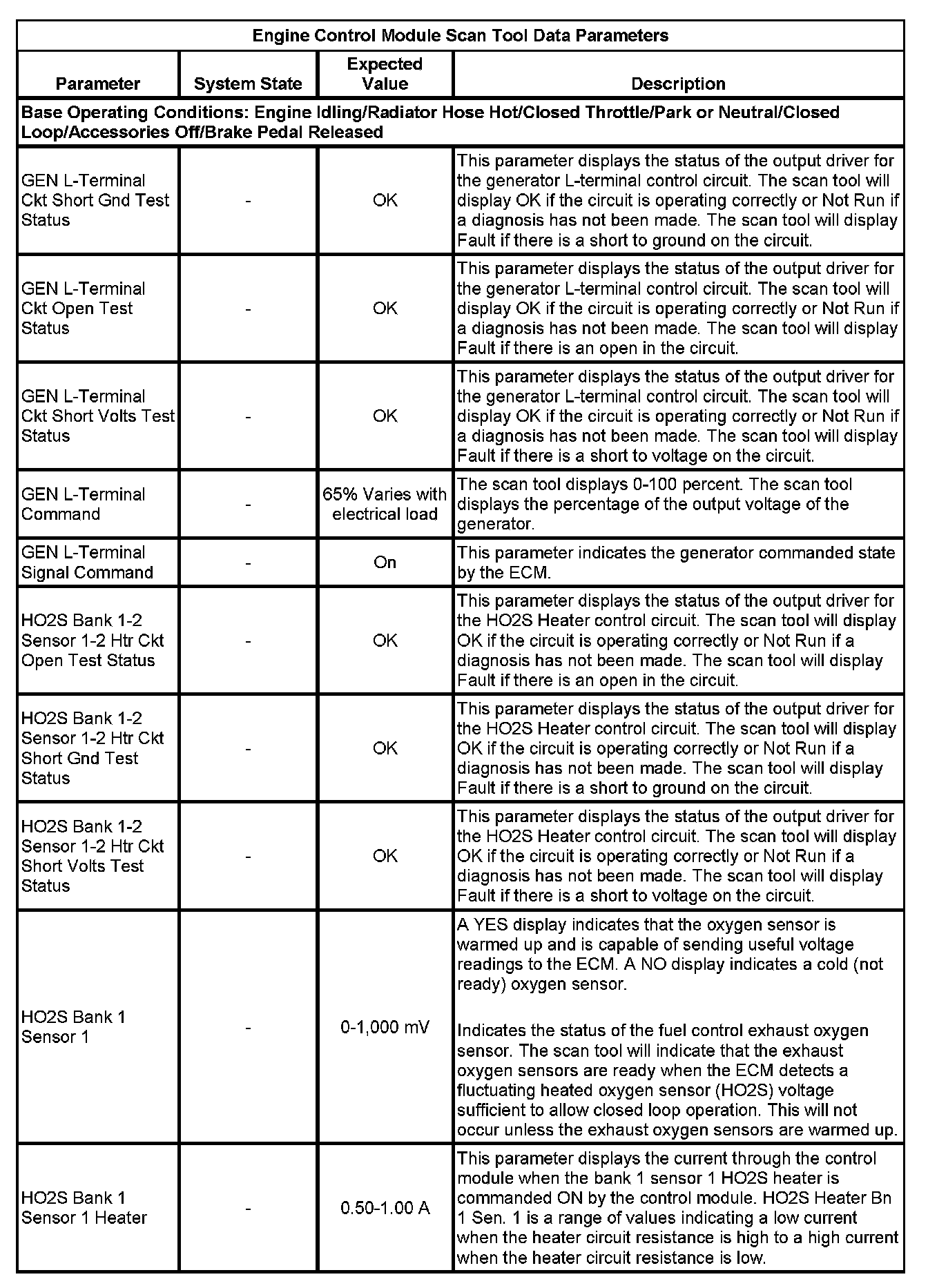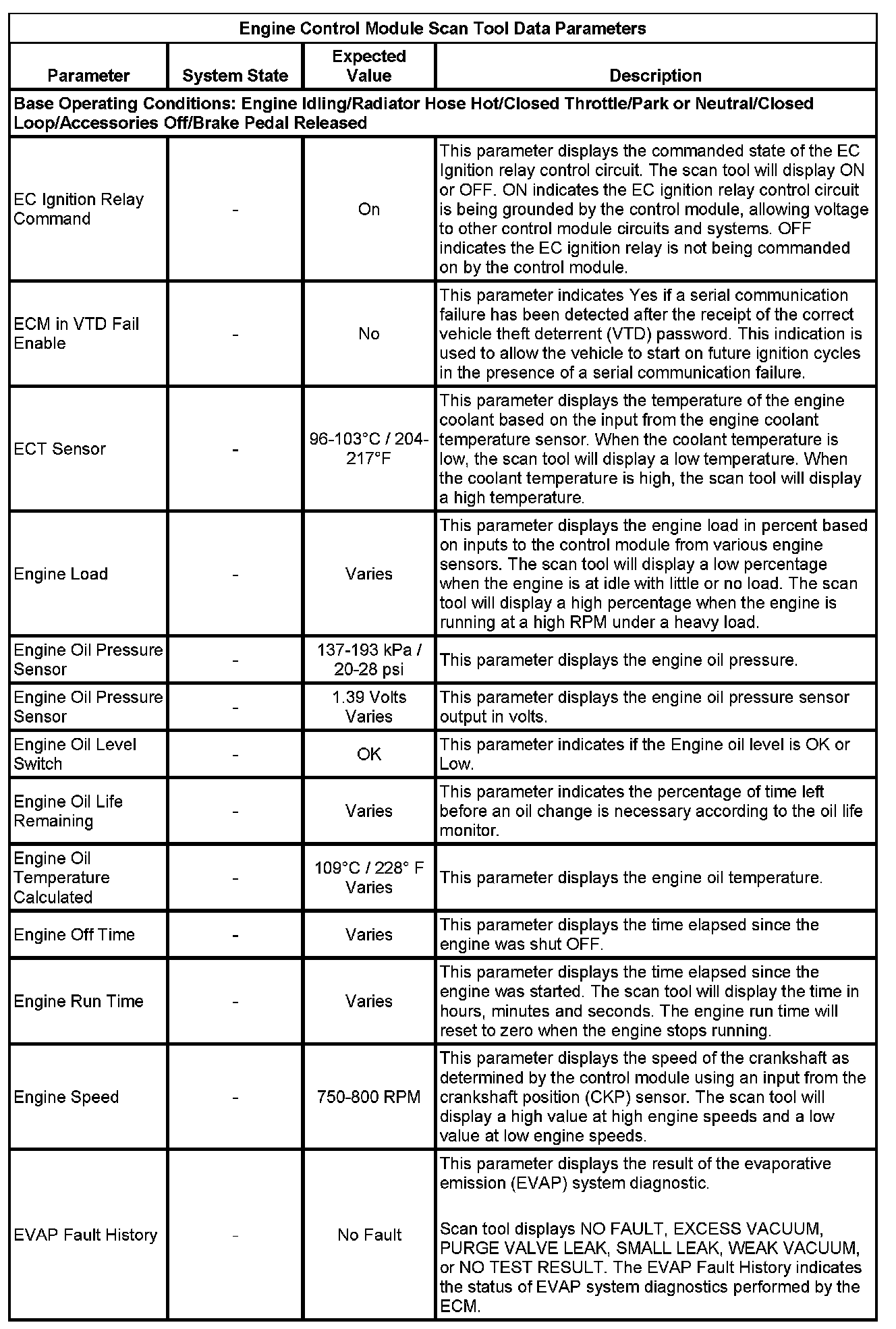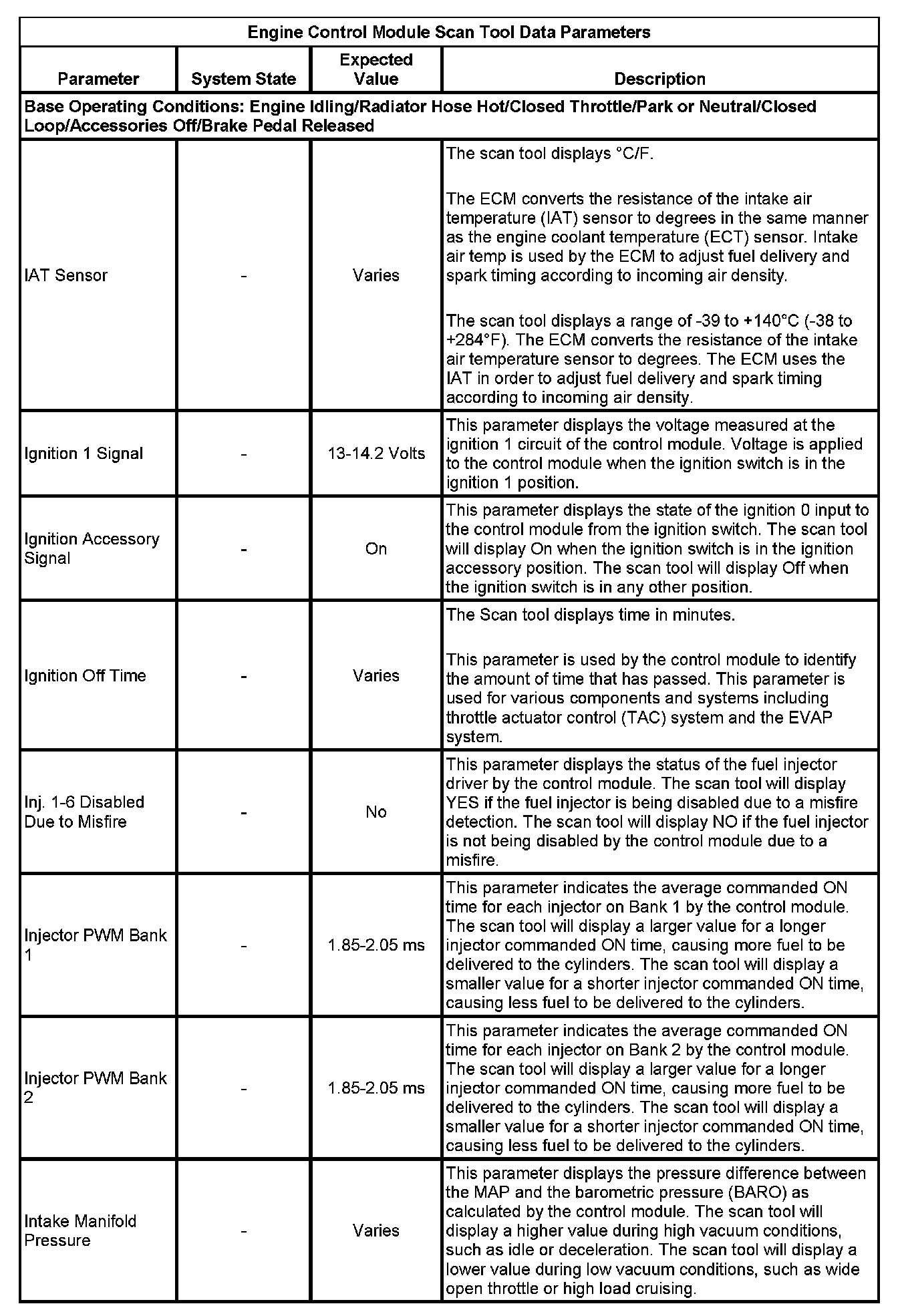 The scan tool values from a properly running engine may be used for comparison with the engine you are diagnosing. The Engine Scan Tool Data List represents values that would be seen on a normally running engine.