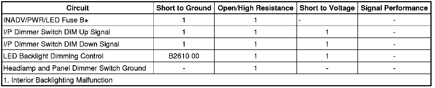 The up/down dimmer controls located on the headlamp and panel dimmer switch is used to increase and decrease the brightness of the interior backlighting components. Each dimmer control switch provides a voltage signal that will increase as the brightness of the lights are increased and decrease as the brightness of the lights are decreased. The body control module (BCM) supplies each dimmer control switch with a signal circuit. When either the up or down dimmer control switch is placed in the desired position, the dimmed voltage setting is applied from the appropriate dimmer control switch through the dimmer switch signal circuit to the BCM. The BCM interprets the signal and applies the dimmed voltage to the LED backlight dimming control circuit and the interior backlighting components dim to the requested level.
