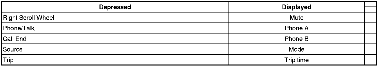 Ignition ON, while depressing the individual push button steering wheel control switches, observe the scan tool and verify the status of the individual steering wheel control switches. The following values should display depending on which switch is depressed.