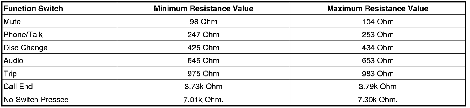 The instrument panel cluster (IPC) supplies a regulated voltage supply to the steering wheel control switches and monitors the return signal. Each switch state is associated with a specific resistance value. When a switch is depressed a specific voltage drop occurs across the resistor unique to that switch. The IPC is able to identify which switch was depressed by recognising the voltage drop associated with that switch and responds to the selected request.