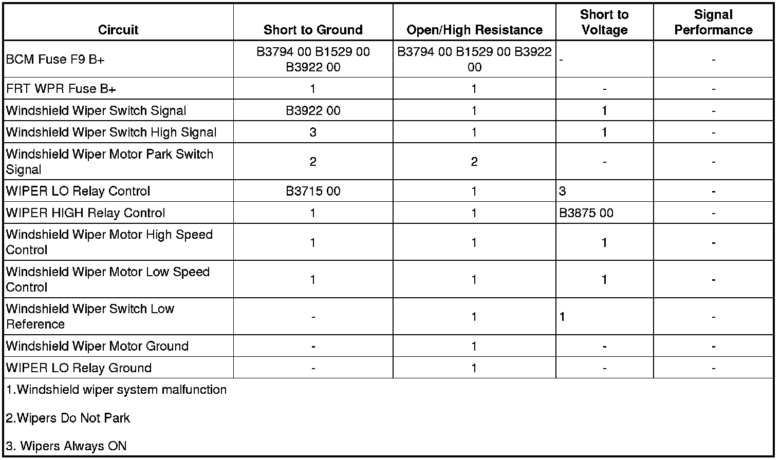 The BCM detects a short to ground on the windshield wiper switch low speed signal circuit with wiper switch in OFF position and ignition in the OFF position .