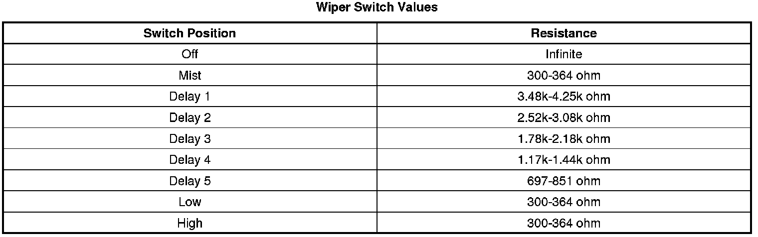 3. While cycling the wiper switch through each delay and speed position, test for the specified resistance between the low reference terminal 8 and the signal terminal 7.
