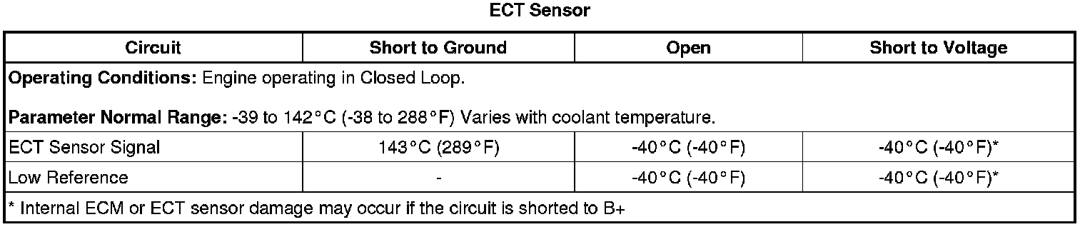The ECM detects that the ECT is colder than -39°C (-38°F) for greater than 4 seconds or a cumulative of 30 seconds.