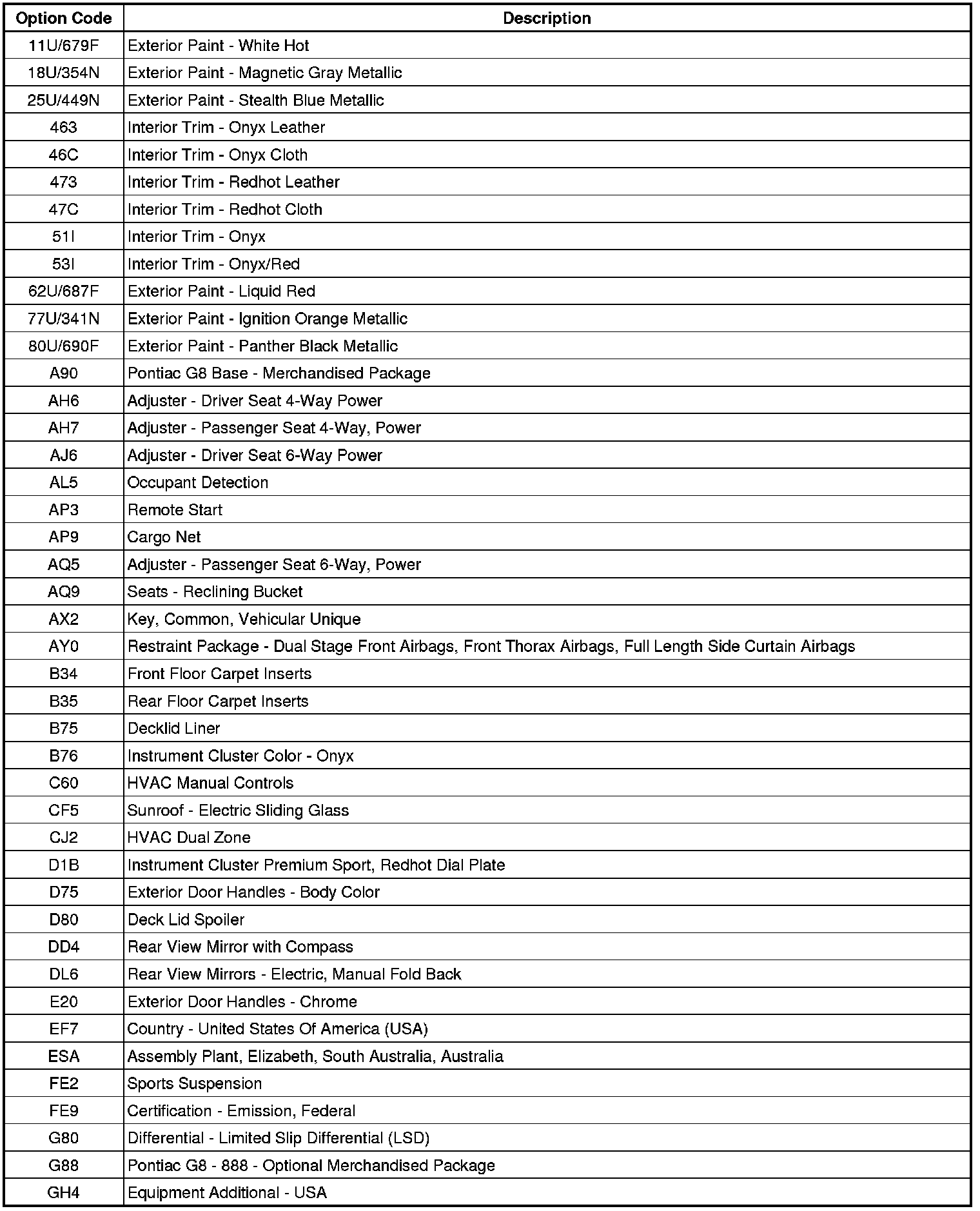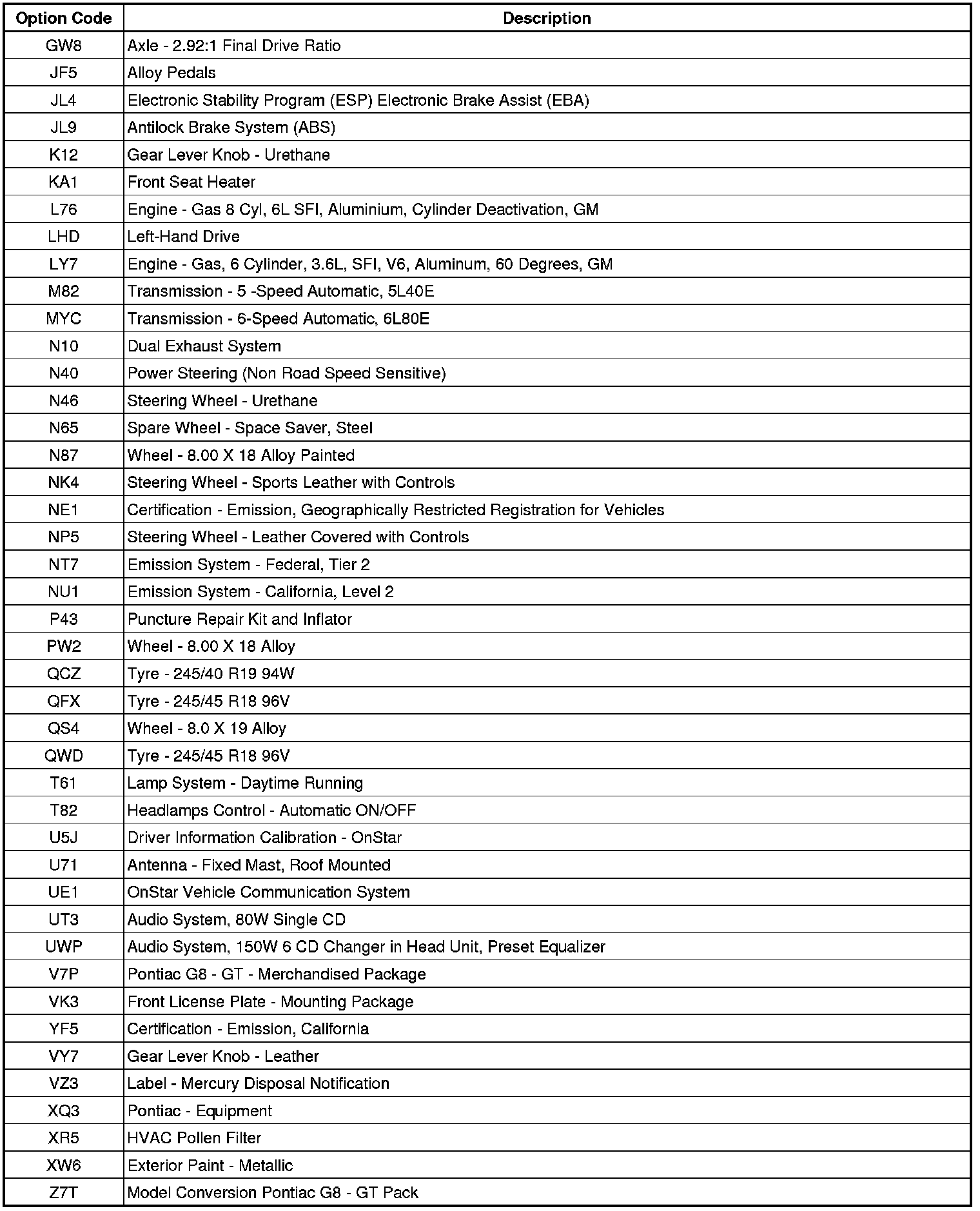 RPO Code List
