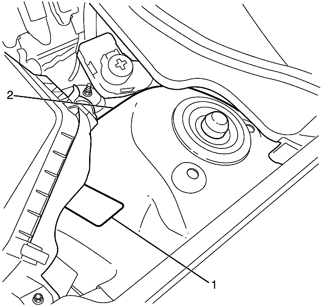 The body and option identification plate (1) is located on the left strut tower (2) and contains the following information: