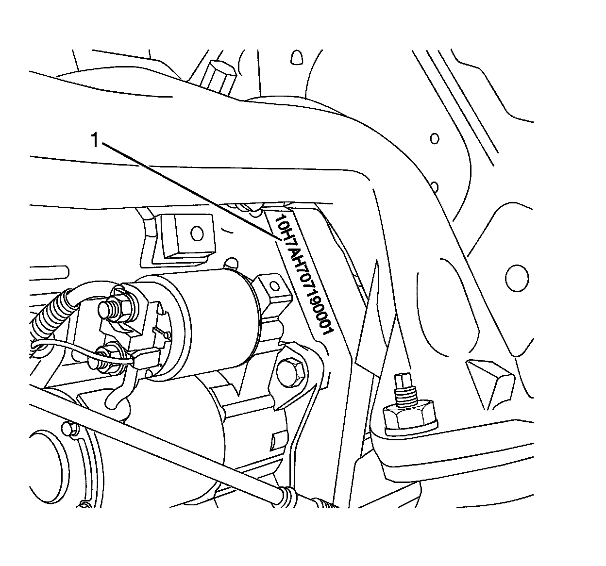 The vehicle identification number (VIN) is located on the left side rear of the engine block (1) and is typically a 9 digit number stamped or laser-etched onto the engine at the vehicle assembly plant.